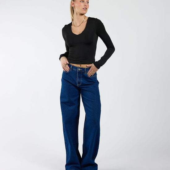 The Indy Mid Waist Super Wide Leg Jeans are your new go-to denim for everyday wear. The mid-waist fits beautifully, and the extra-wide legs give them a relaxed look. The deep dark blue color is totally on-trend and adds a stylish, timeless vibe to any outfit. The durable denim ensures they stay in shape and are comfortable to wear. Perfect with a basic top, a knit, or a blazer for an effortlessly stylish look.