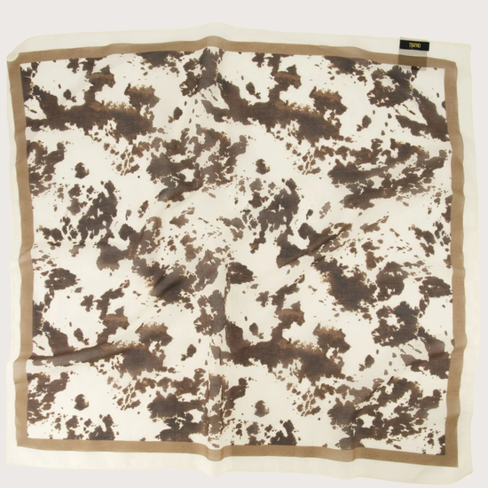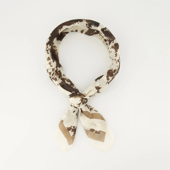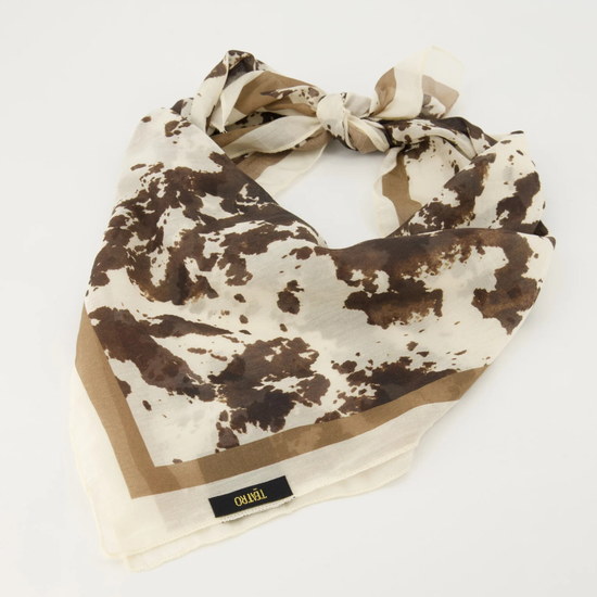 De Astrid sjaal in koeprint is een echte eyecatcher en geeft elke outfit een trendy twist. Met zijn opvallende print en afmeting van 65 cm is deze sjaal een veelzijdig accessoire dat je op talloze manieren kunt dragen, om je nek, in je haar of speels vastgebonden aan je tas.