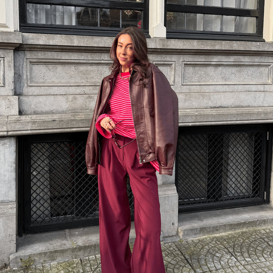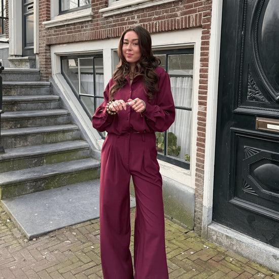 De pantalon sluit met een knoop- en ritssluiting. Pantalon Jip is perfect om te dragen als set met de bijpassende Jip blouse voor een toffe, trendy co-ord look, maar werkt net zo goed als stijlvolle basis bij andere items in je kast. Een echte eyecatcher die je moeiteloos styled van casual tot chic! De Jip set is verkrijgbaar in bordeaux en navy.