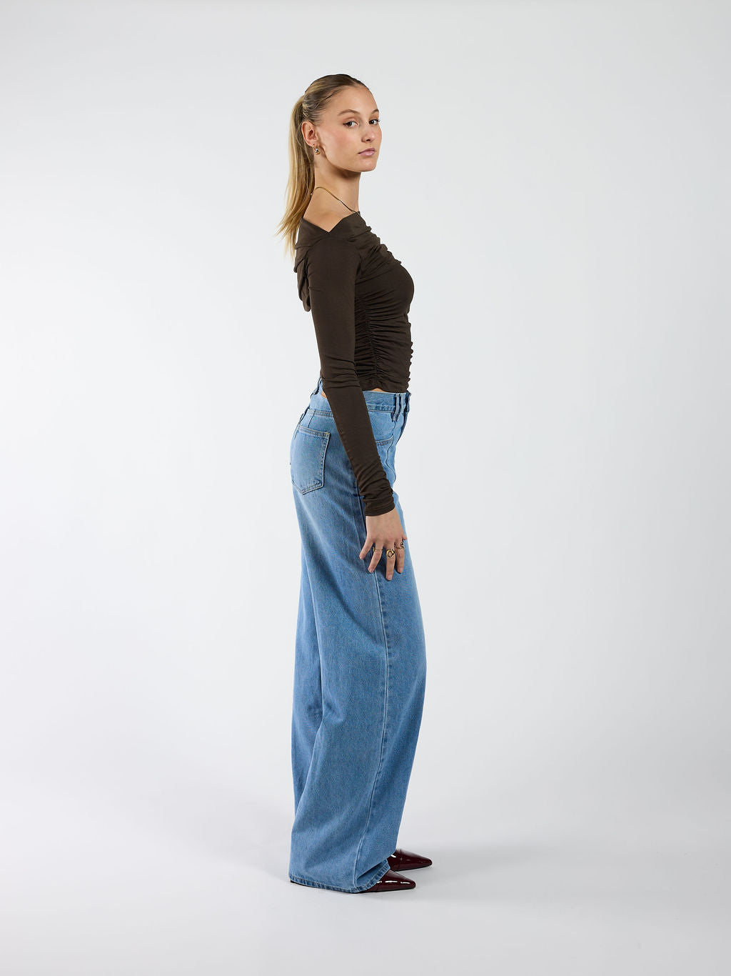 De top is off shoulder te dragen en heeft subtiele ruches aan de zijkanten voor een flatterend effect. De pasvorm is licht asymmetrisch, wat zorgt voor een speelse en vrouwelijke uitstraling. Door de plooien in de stof kun je de top naar wens stijlen!