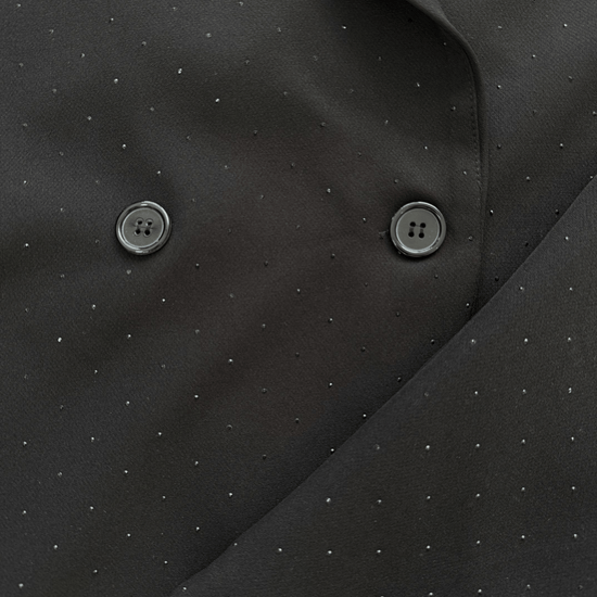 Deze blazer is de perfecte mix van vrouwelijk, classy en edgy. De zwarte stof is afgewerkt met subtiele studs die de look een feestelijke touch geven, zonder dat het te veel wordt. Hij accentueert je taille met twee knopen aan de voorkant en heeft een licht uitlopende pasvorm die prachtig langs je lichaam valt. De schouders zijn iets breder voor een krachtige, elegante uitstraling, terwijl de taille mooi aansluit.