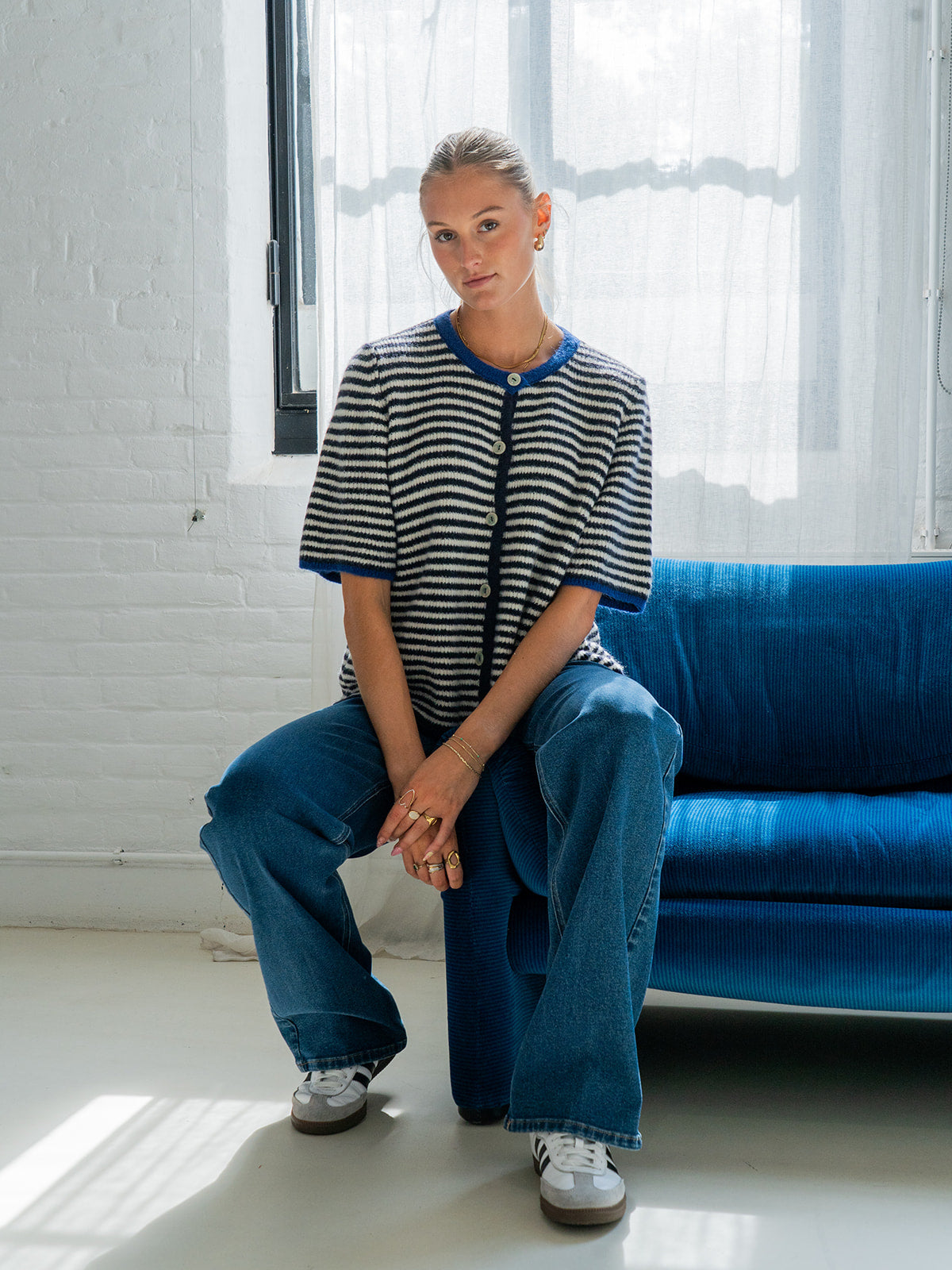 Lena Gebreid Vest met Knoopjes | Wit Donkerblauw gestreept | Tall
