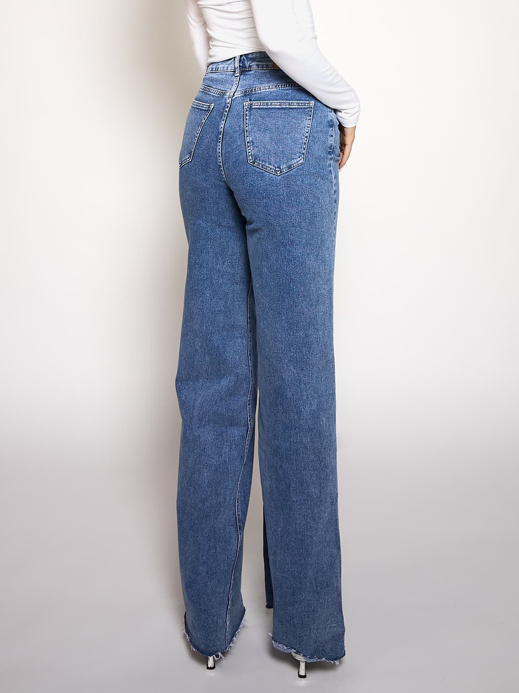 Details: de spijkerbroek heeft een onafgewerkte onderkant.
